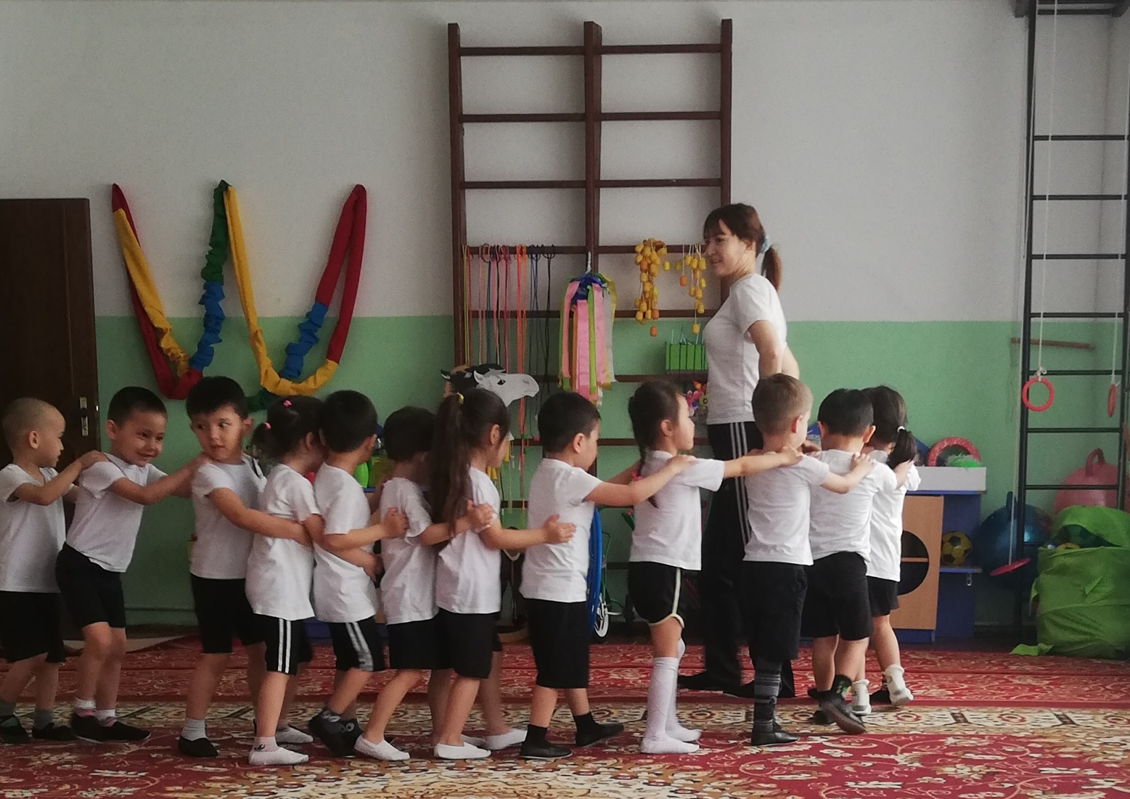 Таяқшалармен жалпы жасалатын жаттығулар. 1 «Таяқшаларды ауыстырып сал» Б.қ сәл алшақ,қол төмен.Қолды алға созып,таяқшаны бір қолдан екінші қолға ауыстырып салу 4-5рет. 2 «Таяқшаны көтер» Б.қ қолды жанына қойып тіреле,аяқты алшақ қойып еденге отыру.Отырып екі қолмен таяқшаны, жоғары -төмен көтеру.5-6рет 3 «Әрі бер» Б.қ таяқшаны алға- артқа жаттығу жасау 3-4рет 4 «Таяқша менікі- сенікі» Б.қ аяқ сәл алшақ,таяқшаны ұстап оңға- солға жаттығу жасау 4-5рет. 5 «Отырып тұр» Таяқшаны ұстап ,аяқты бүкпей еңкейе алға артқа жасау 4-5рет. Тыныс алу жаттығу: Шарты: Ауаны ішімізге толтырып,жерге жатып шиыршықтың ішіндегі допты бір- бірімізге үрлейміз. Негізгі қимыл қозғалыс жаттығулар. Допты жоғары лақтырып,екі қолмен ұстап алу. Допты еденге лақтырып оны қағып алу. көрсету.Балалар бірге қайталайды. Еркін ойын: «Шиыршық» Шарты: Яғни барлығымыз қол ұстасып,шиыршықты қолдан түсірмей,шиыршықтан барлығымыз өтіп шығамыз.